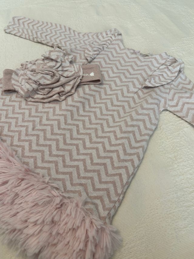 Dettagli del prodottoBellissimo vestitino più fascia per neonata della marca Nanán, taglia 9 mesi.