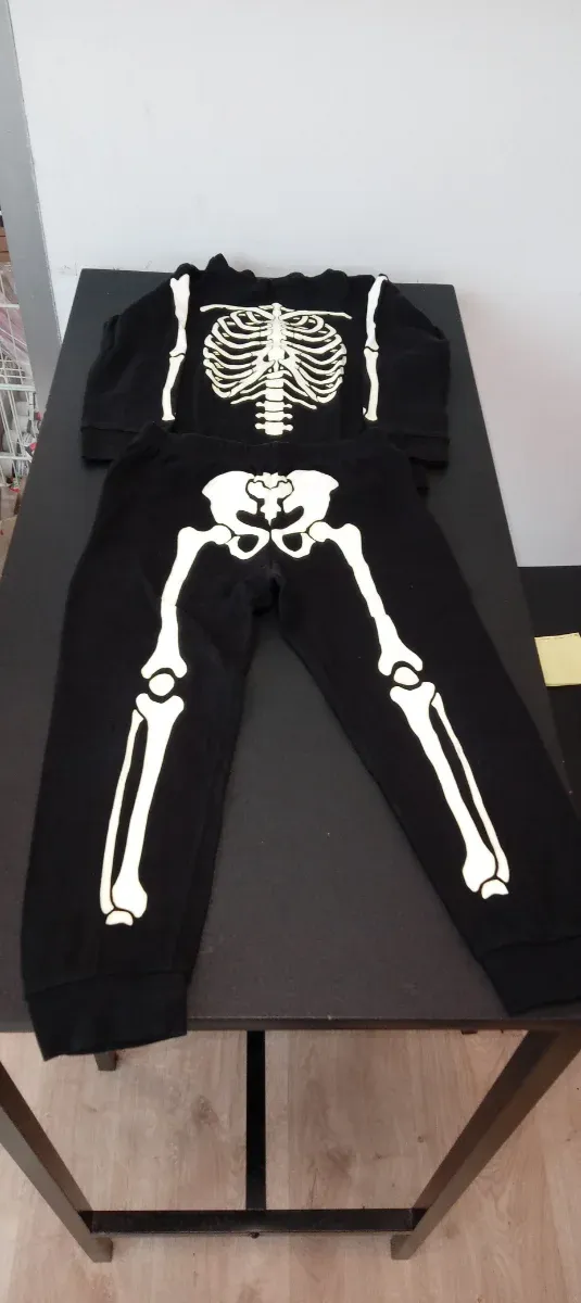 Completo per travestimento da scheletroin cotone, ideale per Halloween. - Stampa di ossa su maglia e pantaloni. - Si illumina al buio - Taglia 104 cm.