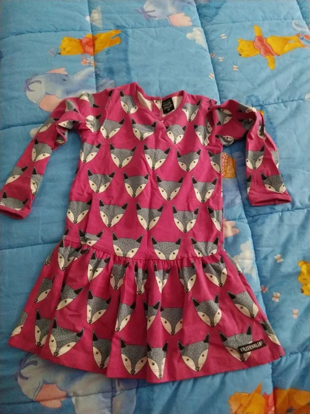 Vestito a maniche lunghe VillerValla con stampa di volpi. - Taglia 116 cm. - Stampa all-over di volpi grigie e bianche su sfondo fucsia. - Orlo a balze.