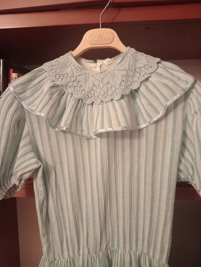 Dettagli del prodottoVestito in cotone con colletto lavorato all'uncinetto e volant. Chiusura dietro con cerniera, elastico in vita