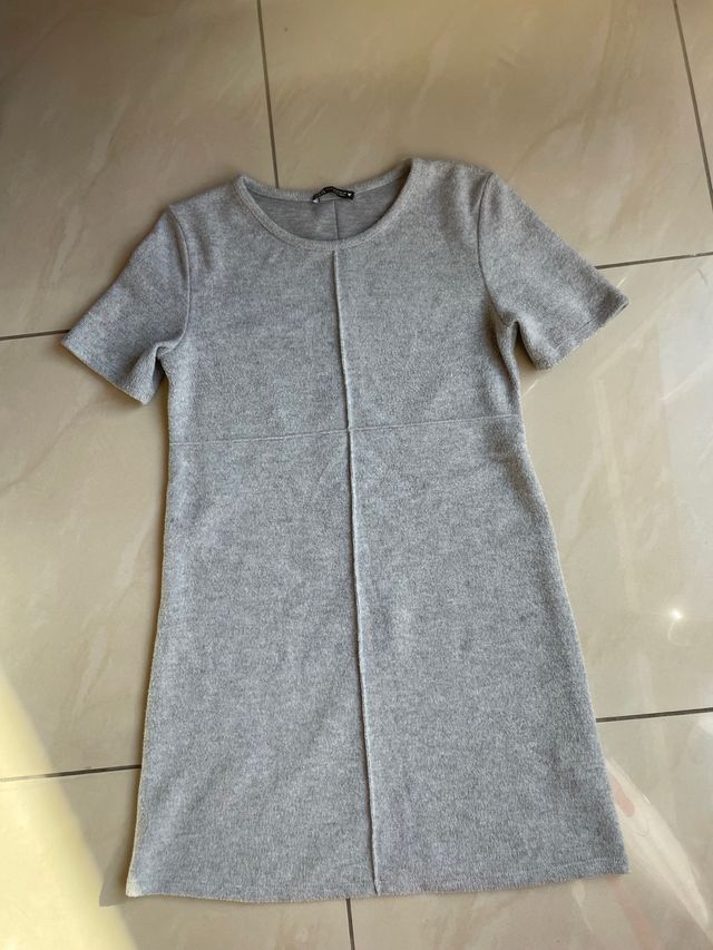 Vestito corto Zara di colore grigio. - Maniche corte. - Girocollo. - Cuciture verticali e orizzontali sul davanti.