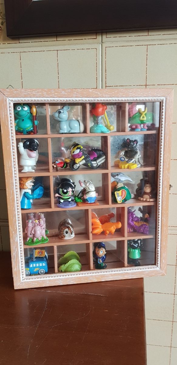 Dettagli del prodottoVetrinetta pensile da parete in legno, con sportellino in vetro, forma rettangolare completa di tutti i pupazzetti all'interno come in foto. Misure del prodotto