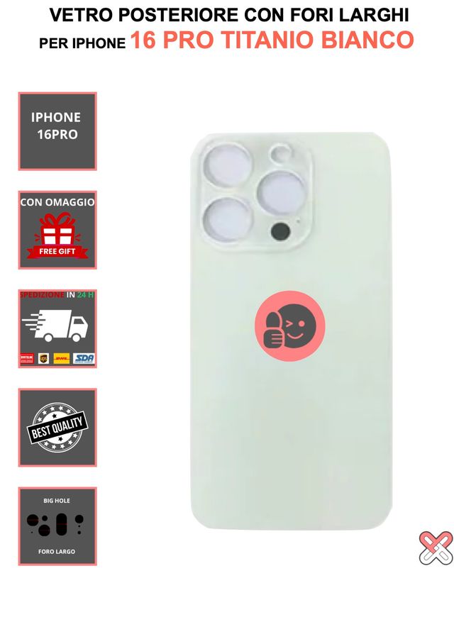 VETRO RICAMBIO PER IPHONE 16 PRO TITANIO BIANCO CON FORI LARGHI QUALITÁ OEM CON LOG