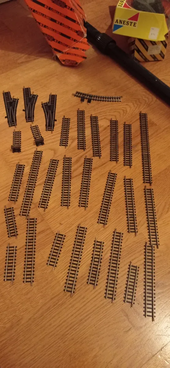 Set di binari per trenini giocattolo, marca Ibertren. Include binari dritti e curvi. Inoltre, sono inclusi deviatoi e incroci.