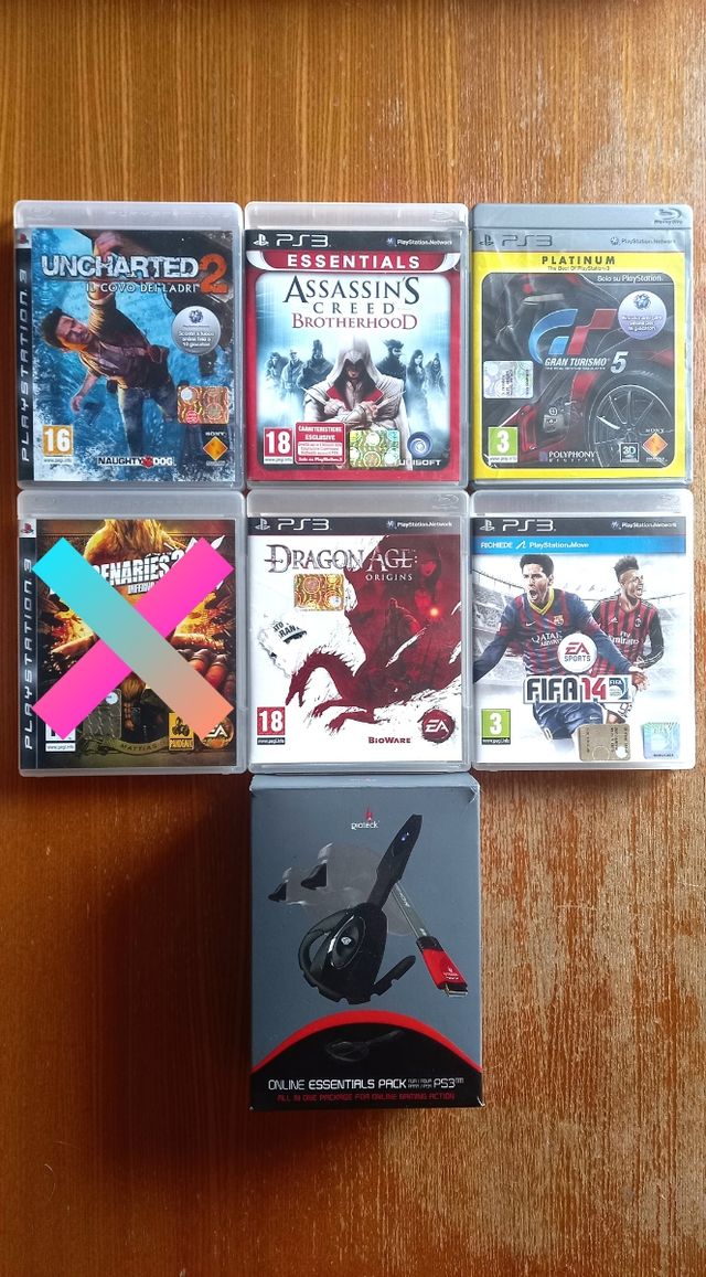 Dettagli del prodottoCinque videogiochi per Play Station 3: "Uncharted 2", "Assassin's Creed Brotherood", "Gran Turismo 5", "Dragon Age: origins" e "FIFA 13". È compreso anche un auricolare accessorio per giocare online in condizioni discrete.