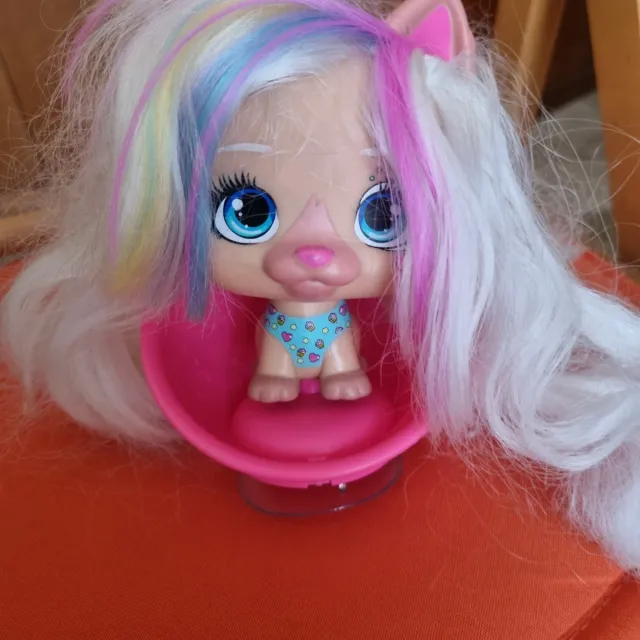 Bambola Vip Pets con lunghi capelli colorati - Capelli con striature arcobaleno. - La bambola è seduta in una sedia rosa.