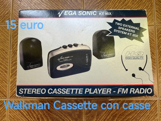 Walkman mangia Cassette e FM Radio, con 2 casse esterne e cuffiette, Nuovo. Ancora nella confezione originale, Vintage. Sega Sonic KT 90X, 2 casse esterne System KT 20X. Vendo per inutilizzo.