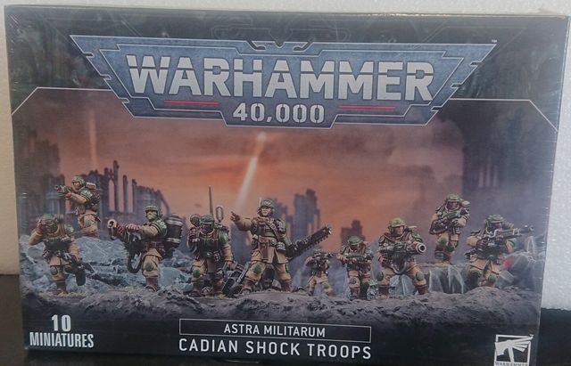 Scatola di miniature per Warhammer 40,000. - 10 miniature di Cadian Shock Troops. - Fa parte della fazione Astra Militarum.