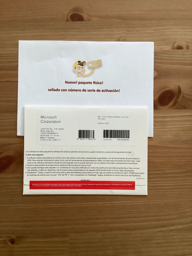 Confezione sigillata di Windows 10 Pro in lingua spagnola. - Versione 20H2. - Edizione DSP OEI DVD. - Include numero di serie