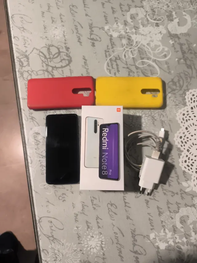 Telefono cellulare Xiaomi Redmi Note 8 Pro in colore blu. Capacità di archiviazione di 128 GB. Memoria RAM di 6 GB. Include caricatore e cavo. Sono incluse due custodie protettive, una rossa e una gialla. Presenta segni di utilizzo che non influiscono sul funzionamento.