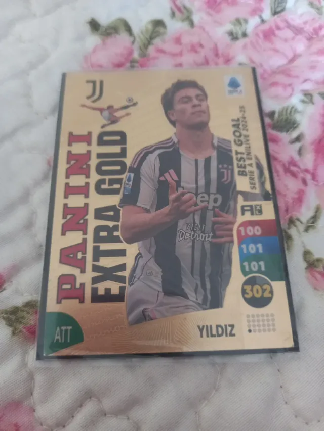 Card Panini Serie A Enilive 2024-25. - Extra Gold edition. - Features player Yildiz. - Includes Best Goal designation. - ATT stat is present.