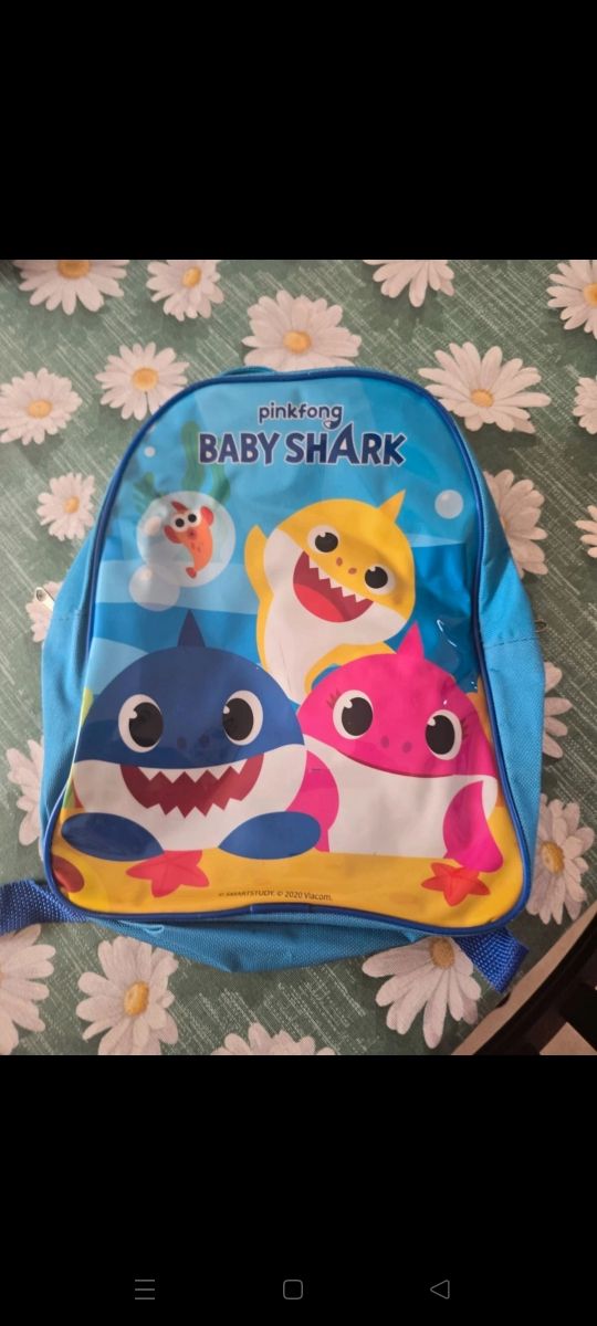 Zainetto per bambini con stampa Baby Shark di Pinkfong. - Perfetto per l'asilo o le piccole uscite. - In buone condizioni, presenta lievi segni di usura.