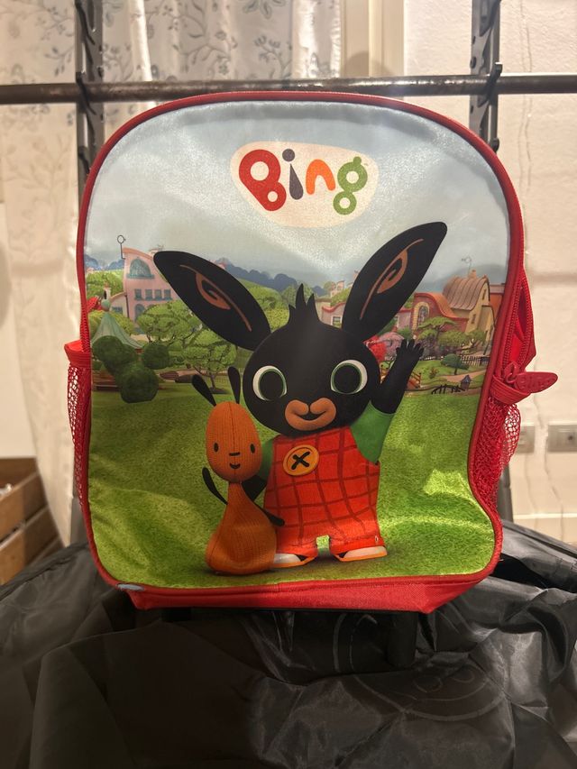 Dettagli del prodottoZainetto per bambini con stampa del personaggio Bing e del suo amico Flop. Ideale per la scuola materna o per le gite.