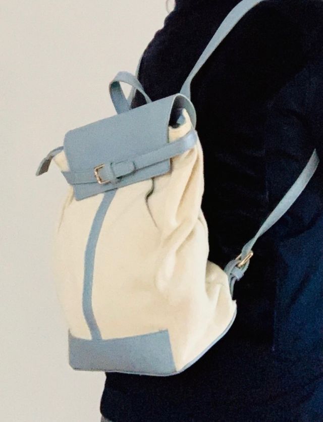 Zaino in iuta colore naturale e pelle celeste. Nuovo mai usato, vendo per inutilizzo. Altre foto disponibili.