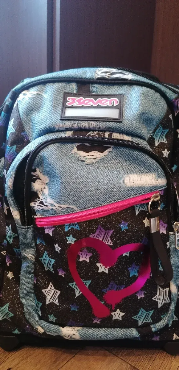 Dettagli del prodottoZaino Seven con rotelle, perfetto per la scuola. Ha un design unico con stelle e cuore.
