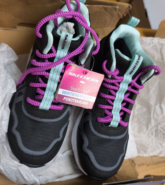 Dettagli del prodottoSneakers Skechers per bambina, numero 32. Sono di colore nero con dettagli in viola e turchese. Resistente all'acqua - Design sportivo. La descrizione è stata tradotta automaticamente.