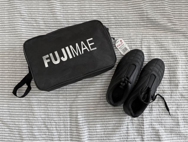 Dettagli del prodottoScarpe Fuji Mae per taekwondo o tatami, taglia 39. Colore nero. Chiusura con lacci. Design imbottito. Mai indossate. La descrizione è stata tradotta automaticamente.