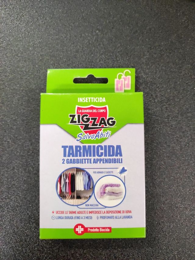 Dettagli del prodottoDisponibili 2 gabbiette appendibili antitarme ZigZag SalvaAbiti. Perfette per armadi e cassetti. - Uccide le tarme adulte e impedisce la deposizione di uova. - Lunga durata fino a 3 mesi. - Prodotto biocida.