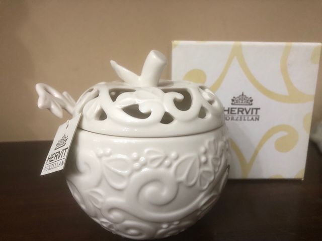 Dettagli del prodottoZuccheriera con cucchiaino realizzata in fine porcellana bianca. Completamente decorata a rilievo ha il coperchio che presenta la lavorazione a traforo. Anche il manico del cucchiaino è realizzato con lavorazione a rilievo. La zuccheriera è completa di scatola regalo decorata.
