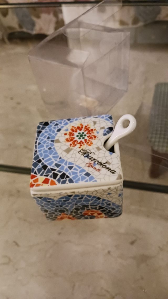 Zuccheriera in ceramica comprensiva di cucchiaino. Fantasia a mosaico Quadrata cm 7 . altezza cm 6.50