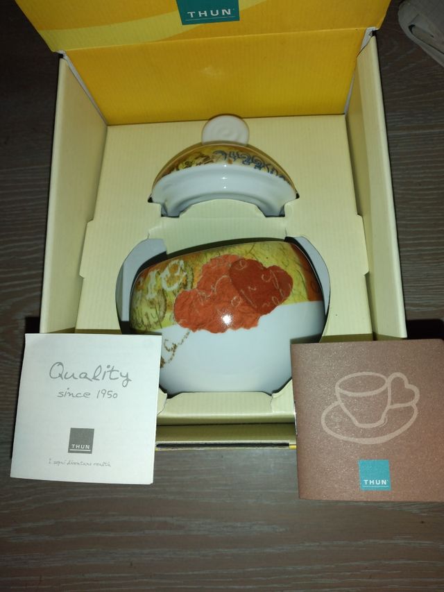 Dettagli del prodottoZuccheriera THUN - Linea Holiday - collezione Caffè al volo. Bellissima, da collezione, molto particolare, con targhette garanzia Materiale: porcellana Capacità: 250 ml Cura del prodotto: lavabile in lavastoviglie NUOVA MAI USATA CON SCATOLA ORIGINALE Misure: 11x11x12cm h; 300 ml capacità Cura del prodotto: idoneo all'utilizzo in microonde e lavastoviglie; non utilizzare spugne abrasive Misure del prodotto