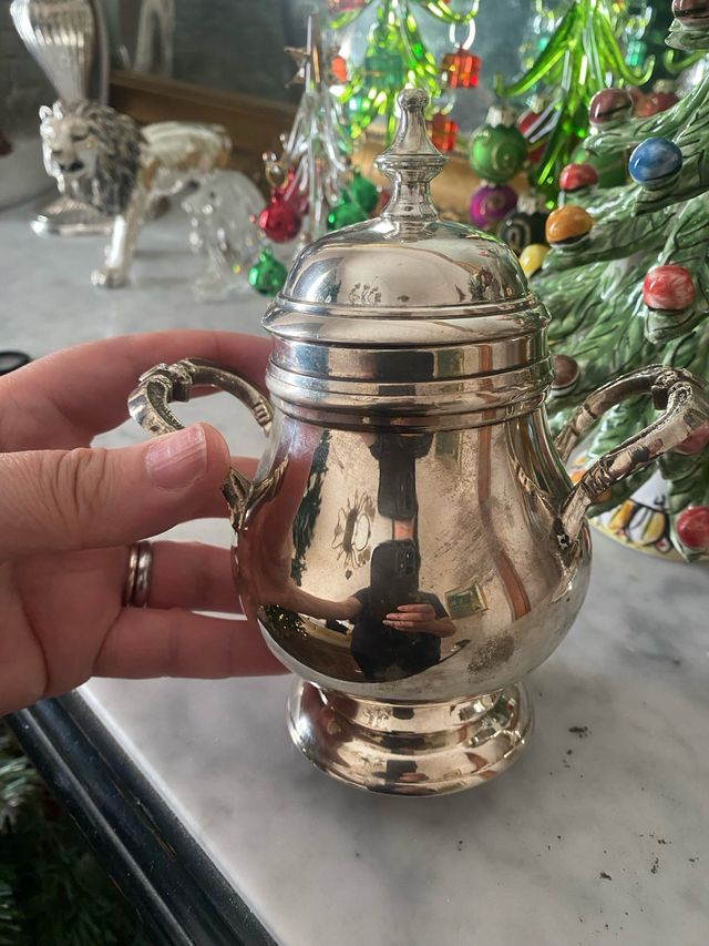 Dettagli del prodottoElegante zuccheriera vintage, perfetta per aggiungere un tocco di classe alla tua tavola. Zuccheriera vintage in metallo argentato, dal design elegante e classico. La forma bombata e le due maniglie lavorate la rendono un pezzo decorativo molto raffinato. Dotata di coperchio originale con pomello finemente sagomato. Ideale sia come zuccheriera da tavola sia come oggetto d’arredo per chi ama lo stile antico o raccolte vintage. Condizioni buone, con normali segni del tempo che donano carattere al pezzo.
