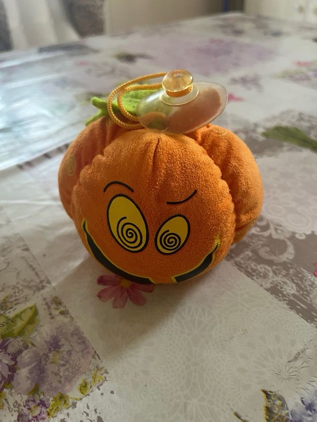 zucchetta di pelusche morbida con aperta dietro a steappo per riporre dolcetti o caramelle. ventosa anche per appendere ad un vetro