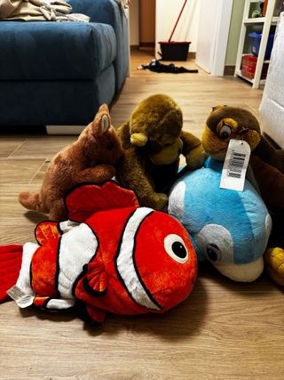Lotto di peluche assortiti, perfetti per collezionisti o come regalo. - Peluche a forma di pesce pagliaccio rosso e bianco. - Peluche di un canguro marrone. - Peluche di una scimmia marrone. - Peluche di un delfino blu. - Peluche di un coniglio marrone con etichetta.