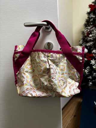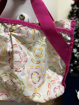 Borsa con un vivace motivo a spirali colorate. - Manici in tessuto fucsia. - Bordatura in tessuto fucsia. - Fodera interna con motivo a spirali. - Chiusura con bottone a pressione.