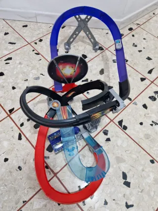 Pista de coches Hot Wheels con loopings y lanzador. - Pista de color naranja y verde. - Lanzador de color azul.