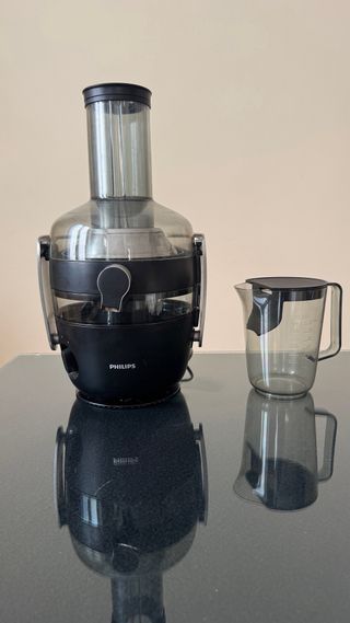 Centrifuga marca Philips, ideal para preparar zumos frescos en casa. Su diseño moderno se adapta a cualquier cocina. - Color negro y transparente. - Incluye jarra medidora.