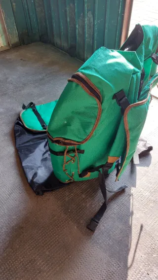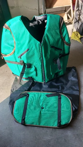Zaino gilet trasformabile in tessuto resistente. - Colore verde e nero. - Tasche con zip. - Cinghie regolabili.