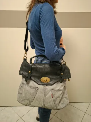Splendida borsa artigianale realizzata in denim Levi's originale con pregiati inserti in vera pelle. Un pezzo robusto e di alta qualità, caratterizzato da un design funzionale e senza tempo. Design: Ampio scomparto principale, tasca interna portaoggetti e pratica tasca esterna con cerniera. Trasporto: Tracolla ad alta resistenza, regolabile e rimovibile per la massima versatilità. Dimensioni: Per un riferimento visivo, la ragazza in foto è alta 1,58 m. Dettagli sulla Vendita La borsa è in condizioni eccellenti, pari al nuovo. Viene venduta esclusivamente per una questione di preferenza personale legata al peso del materiale (