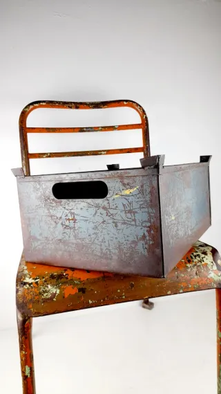 Cassetta industriale in metallo, ideale per conservare o trasportare oggetti. - Materiale: Metallo - Colore: Blu con finiture arancioni - Design industriale