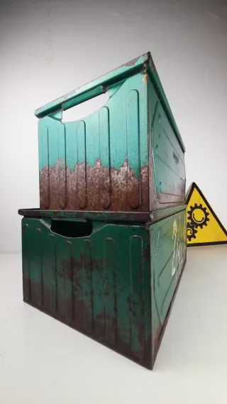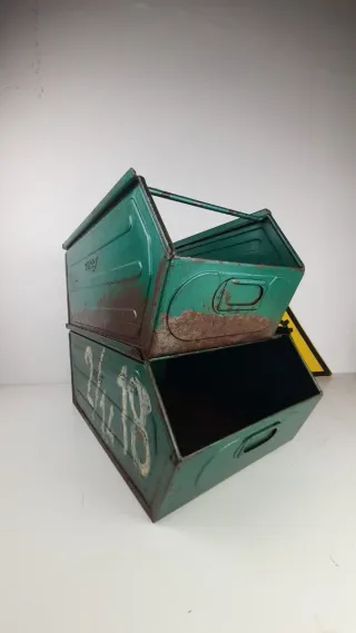 Set di due cassette industriali in metallo, perfette per organizzare e conservare. - Materiale: Metallo resistente. - Colore: Verde con finiture invecchiate. - Design: Impilabili per ottimizzare lo spazio.