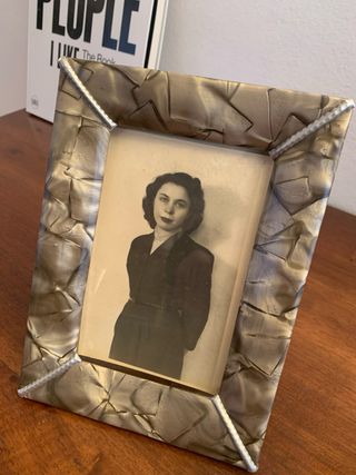 Elegante portafoto d'epoca, risalente agli anni '30. Un pezzo unico per conservare i tuoi ricordi più preziosi. - Cornice decorata con un motivo geometrico. - Finitura metallica con sfumature. - Ideale per fotografie in bianco e nero.
