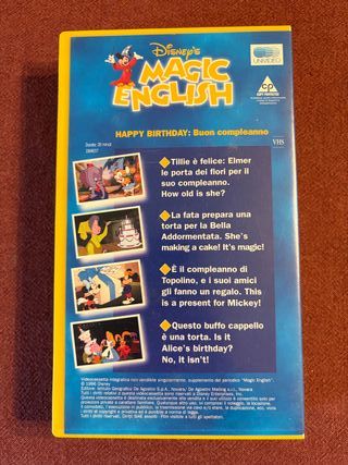 VHS Disney's Magic English numero 7, con il tema Happy Birthday: Buon compleanno. - Copertina con Topolino e Minnie. - Illustrazioni di personaggi Disney come Paperino, Alice e Aurora. - Testo in inglese e italiano.