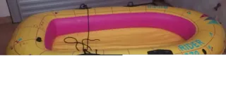 Canotto gonfiabile di colore giallo con dettagli rosa e blu. Presenta maniglie nere e una corda nera. Materiale robusto . 3/4 posti. 2 remi inclusi - Design a forma ovale. - Materiale resistente.