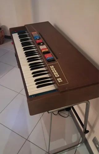 Tastiera elettronica GEM Rodeo 61, uno strumento musicale dal design vintage. - Tastiera a 61 tasti. - Finitura in legno marrone. - Pulsanti colorati per le diverse funzioni.