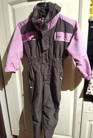 Tuta da sci per bambina, perfetta per le giornate sulla neve. - Colore viola e grigio. - Cappuccio integrato. - Tasche con zip.