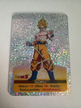 Carta da collezione di Dragon Ball Z. - Personaggio: Goku Supersayan - Attacco: 110 - Difesa: 100 - Ricarica: 1 - Tecnica perfetta: +20 sull'attacco