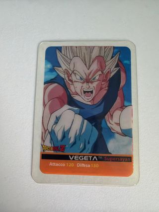 Carta da collezione di Dragon Ball Z. - Personaggio: Vegeta - Trasformazione: Supersayan - Attacco: 120 - Difesa: 130