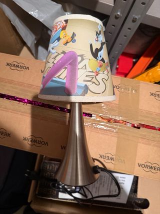 Lampada da cameretta con un divertente design di Bugs Bunny che fa skateboard. Perfetta per aggiungere un tocco di allegria alla stanza. Lampadina inclusa - Illustrazione colorata di Bugs Bunny. - Tema skateboard e città.