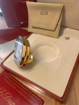 Elegante orologio da tavolo S.T. Dupont, completo di scatola e garanzia. placcato oro 20 micron - Orologio con quadrante bianco e numeri romani. - Cornice esterna verde scuro. - Custodia in pelle beige con logo D. - Scatola originale S.T. Dupont rossa. - Certificato di garanzia internazionale.