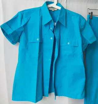 Completo donna estivo azzurro 65% poliestere 35% cotone Include: - Camicia manica corta Tg. M Spalle 42 cm Circonferenza braccio 32 cm Circonferenza petto 96 cm Altezza 58 cm - Pantaloni Tg. L Tasche anteriori Tasche posteriori finte Cordino in vita e caviglie che si può stringere Circonferenza vita 86 cm Circonferenza fianchi 110 cm Altezza 106 cm Lunghezza dal cavallo 73 cm