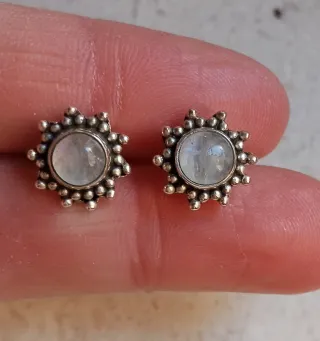 Delicati orecchini realizzati in Argento 925 con incastonata una Pietra di Luna naturale. - Design a forma di fiore stilizzato. - Dettagli con piccole sfere. - Pietra di Luna centrale luminosa.