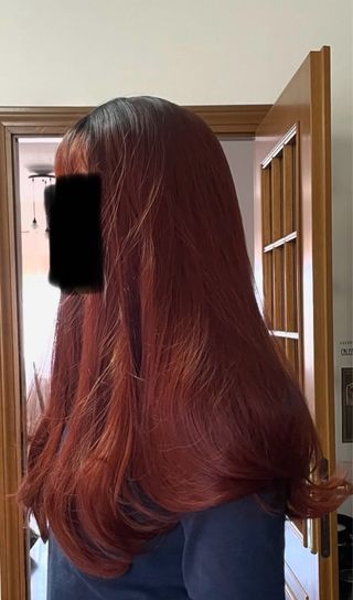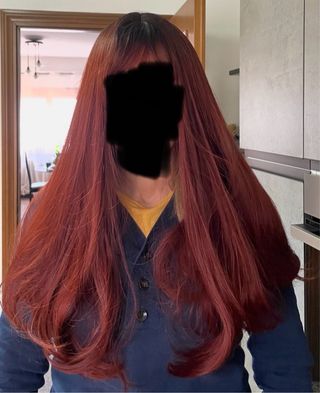 Parrucca sintetica con frangia, dal colore sfumato tra il marrone e il rossiccio. - Capelli lunghi e mossi. - Frangia integrata. - Fibre sintetiche di buona qualità.