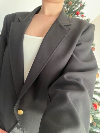 Blazer nero elegante, modello corto con chiusura a singolo bottone dorato, con taschino nella parte interno. Fu acquistato originariamente come giacca da lavoro ma è perfetta anche per altre occasioni. Taglio moderno, perfetta per outfit formali. Indossato una sola volta, Taglia M