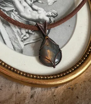 Collana realizzata a mano con filo di rame a forma di goccia con una pietra naturale di Labradorite. La pietra presenta riflessi cangianti. In omaggio cordoncino in pelle presente nella foto. - Pietra: Labradorite - Montatura in filo di rame