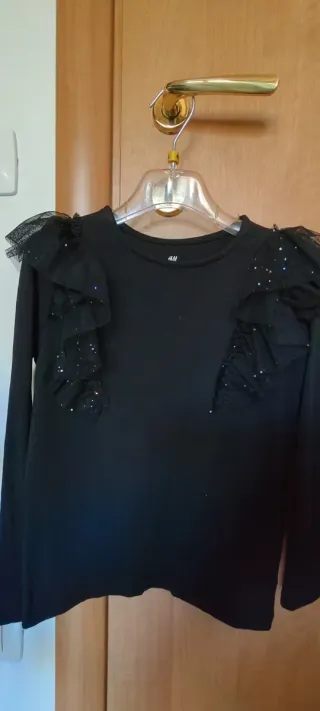 Maglia elegante nera per bambina, marca H&M, taglia 6/8 anni (122/128 cm). Con rouches brillantinate sulle spalle. Ideale per le giornate di festa! Tessuto cotone 95%, elastan 5%.
